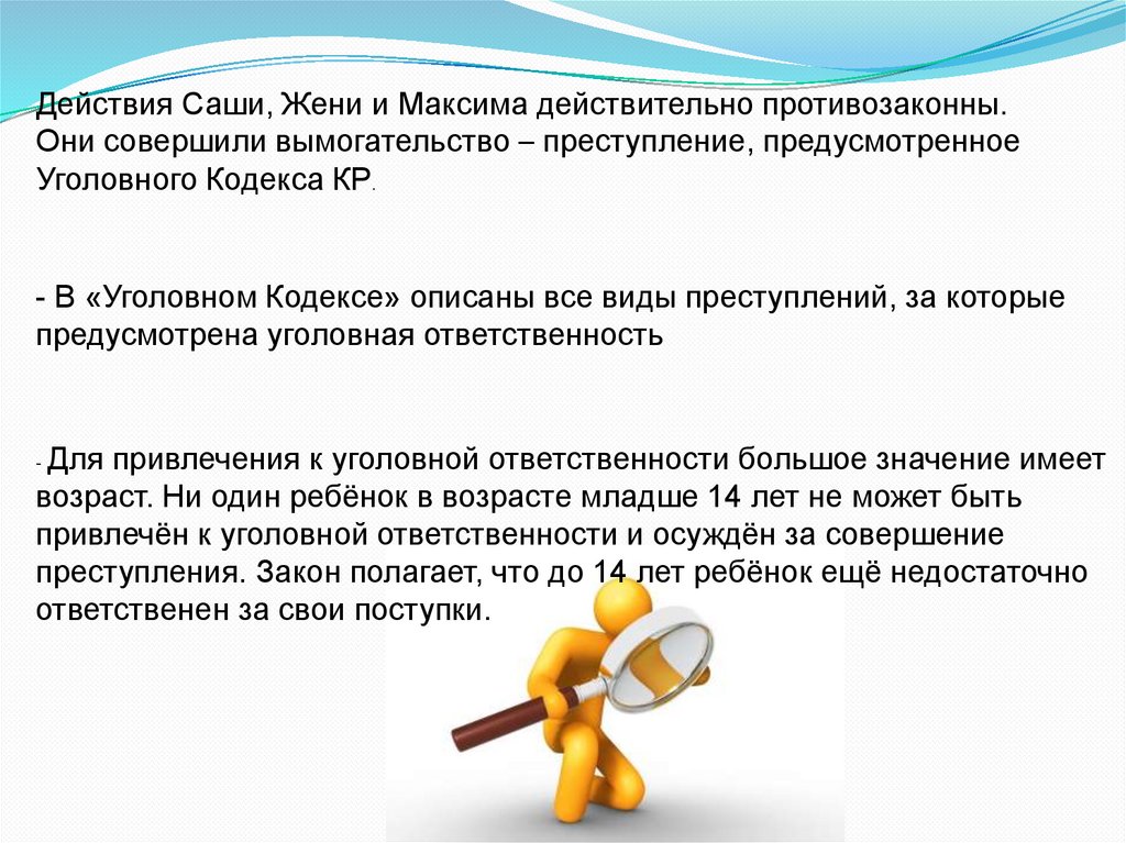 Действия Саши, Жени и Максима действительно противозаконны.Они совершили вымогательство – преступление, предусмотренное