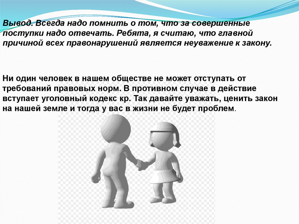 Вывод. Всегда надо помнить о том, что за совершенныепоступки надо отвечать. Ребята, я считаю, что главной