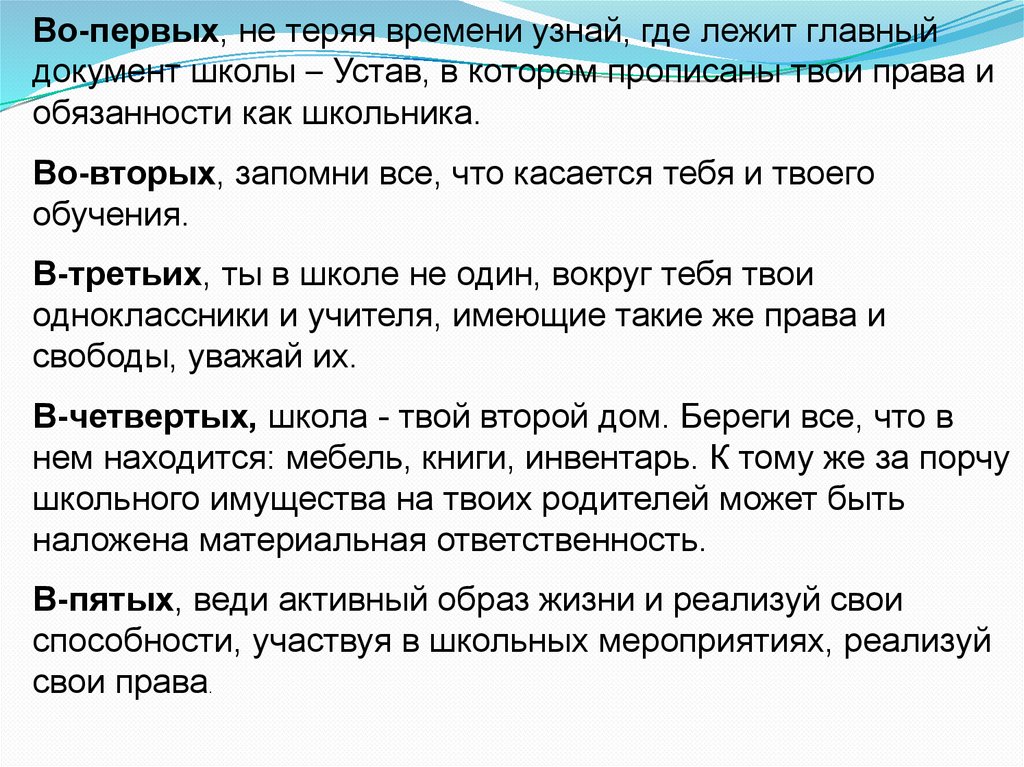 Во-первых, не теряя времени узнай, где лежит главныйдокумент школы – Устав, в котором прописаны твои права и