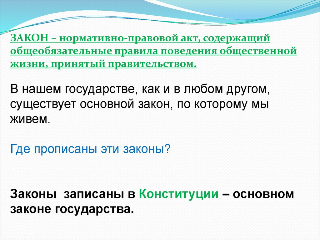 ЗАКОН – нормативно-правовой акт, содержащийобщеобязательные правила поведения общественной