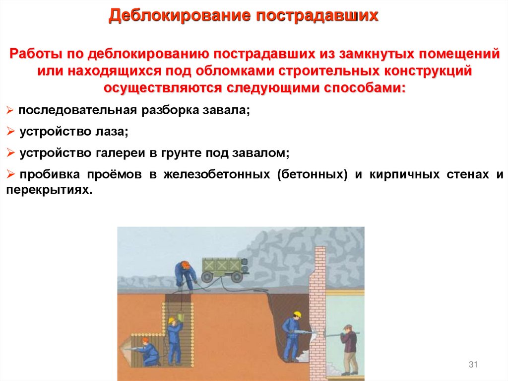 Деблокирование пострадавшихРаботы по деблокированию пострадавших из замкнутых помещений