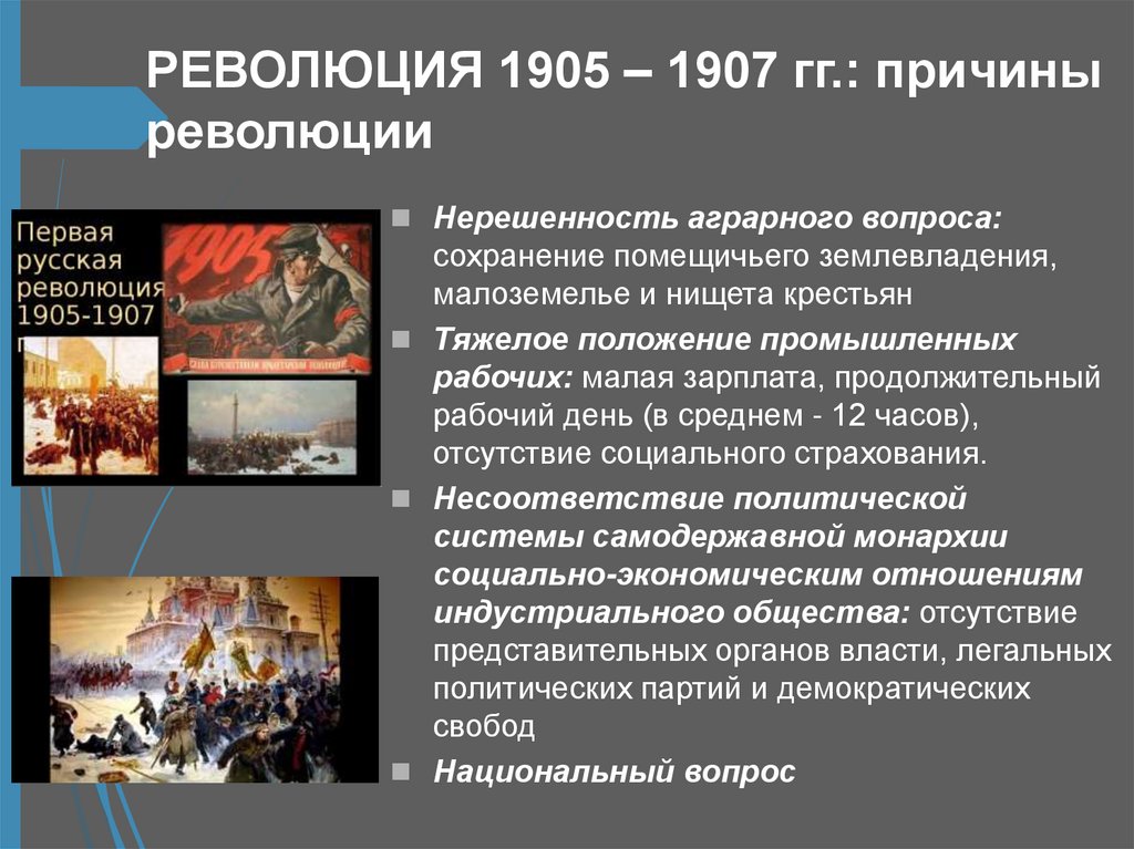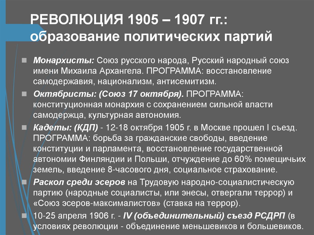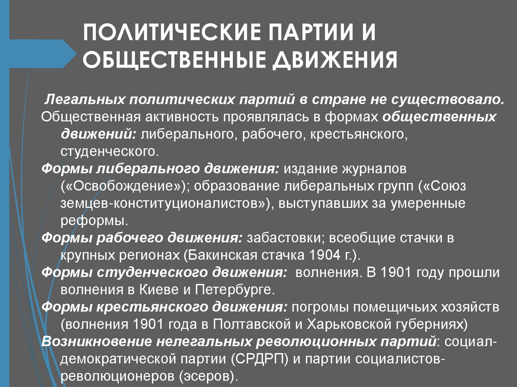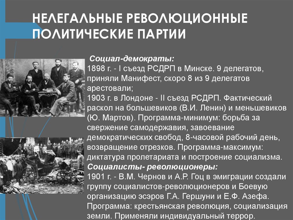 Возникновение нелегальных революционных партий: социалдемократической партии (СРДРП) и партии социалистовреволюционеров (эсеров).