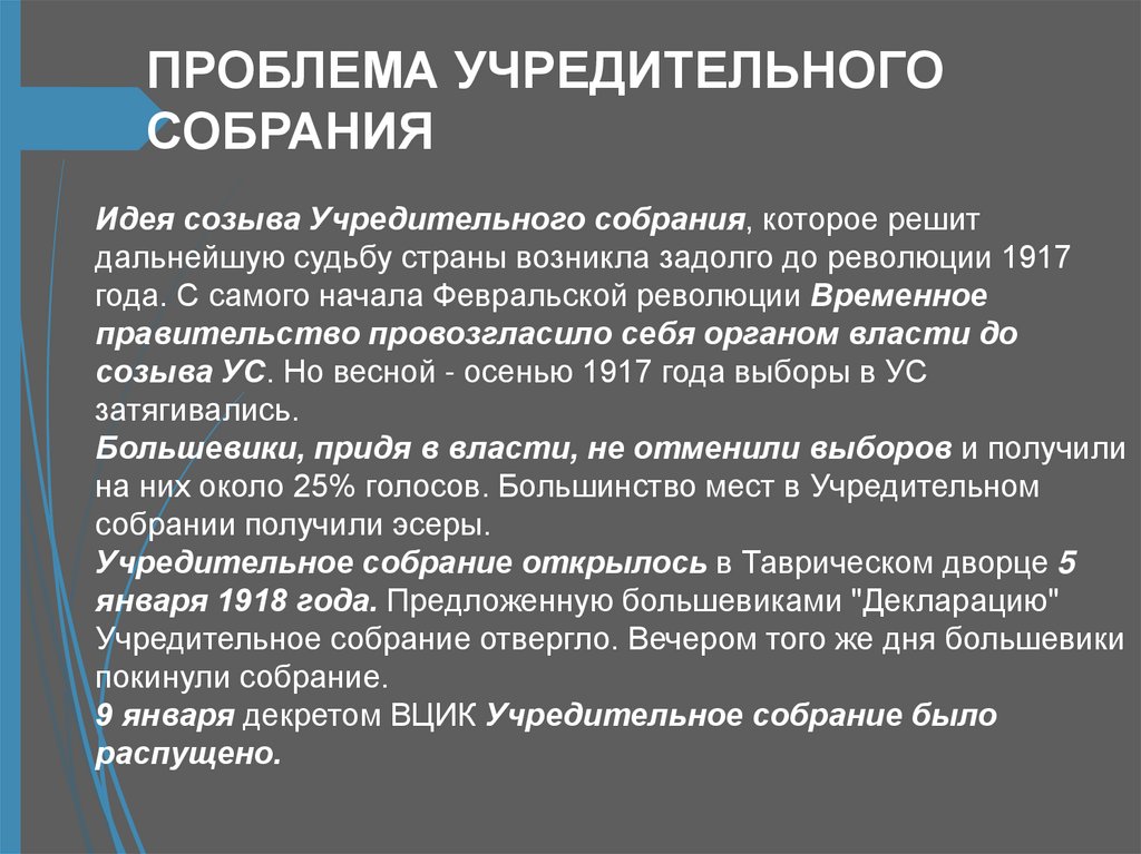 Идея созыва Учредительного собрания, которое решитдальнейшую судьбу страны возникла задолго до революции 1917
