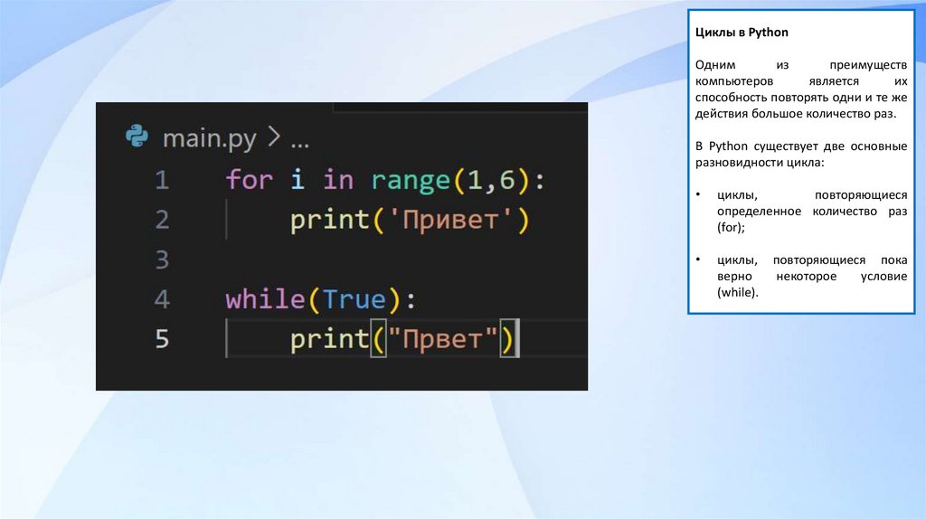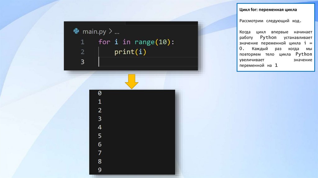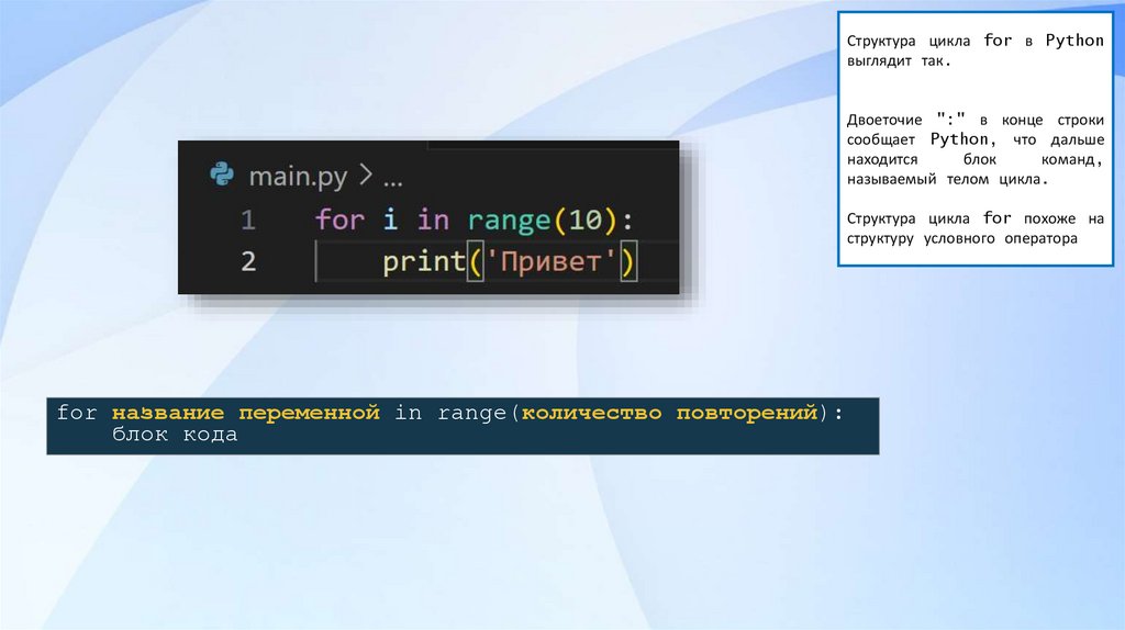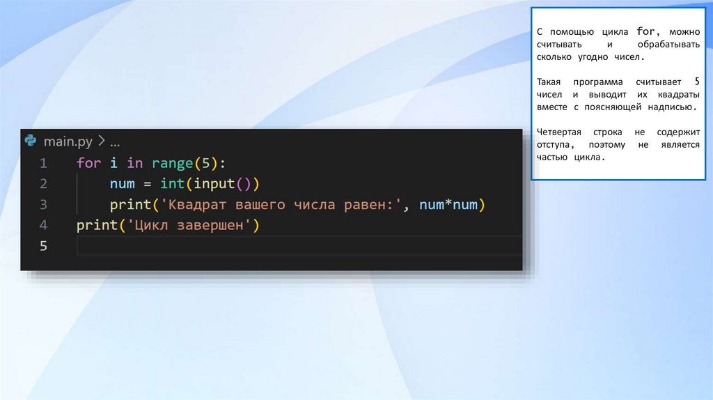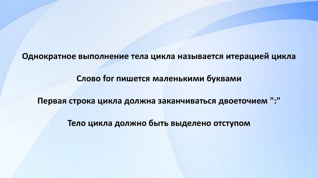 Однократное выполнение тела цикла называется итерацией циклаСлово for пишется маленькими буквами