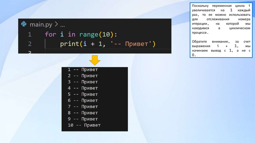 Поскольку переменная цикла iувеличивается на 1 каждый