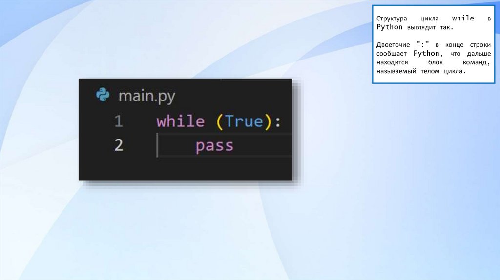 Первая строка цикла должна заканчиваться двоеточием ":"