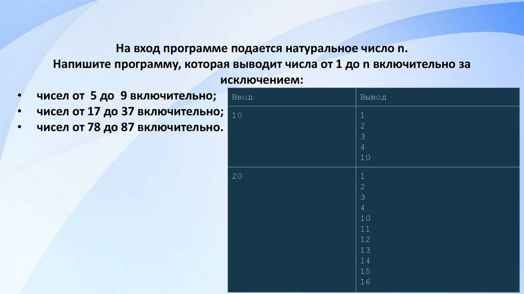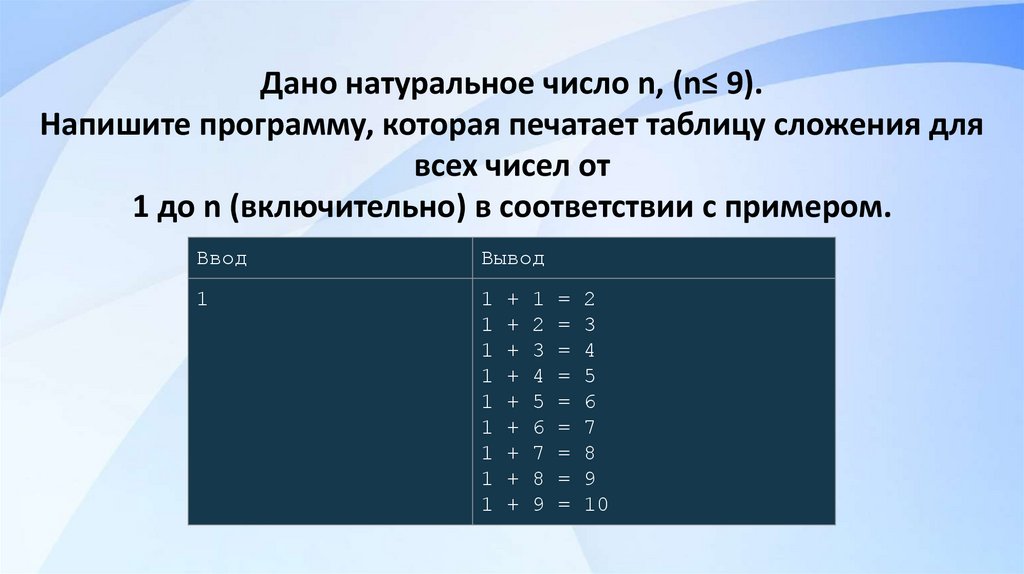 Дано натуральное число n, (n≤ 9).Напишите программу, которая печатает таблицу сложения для