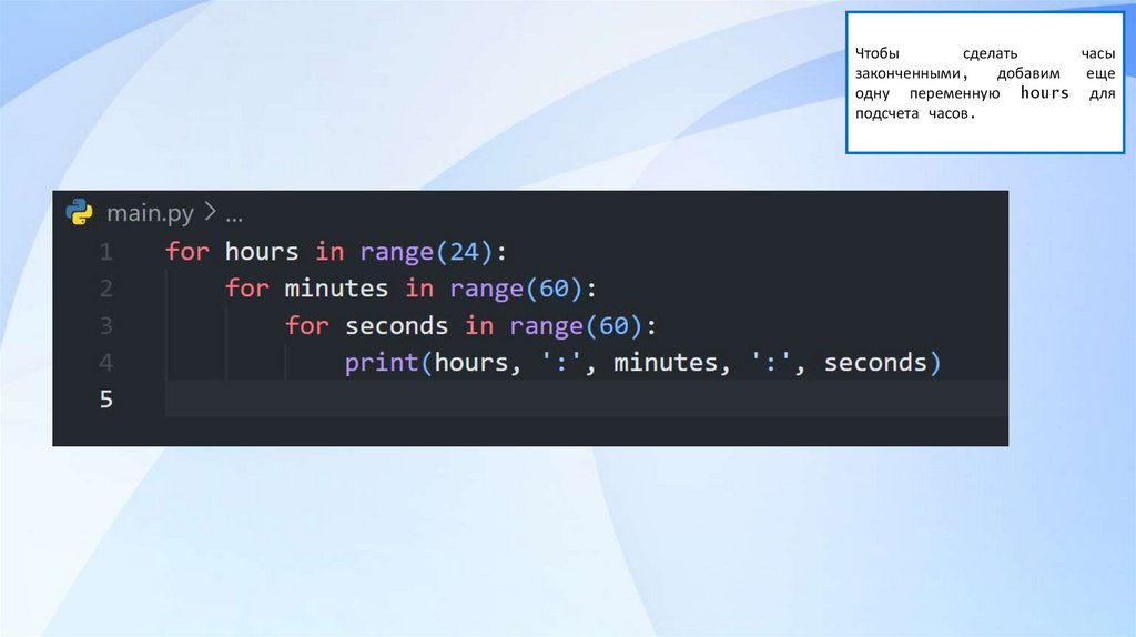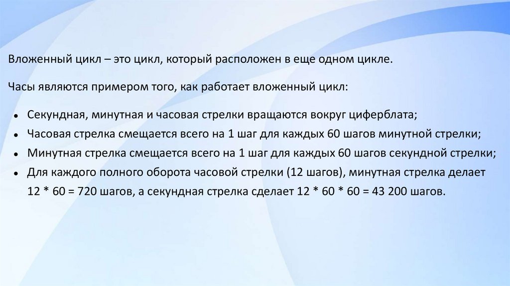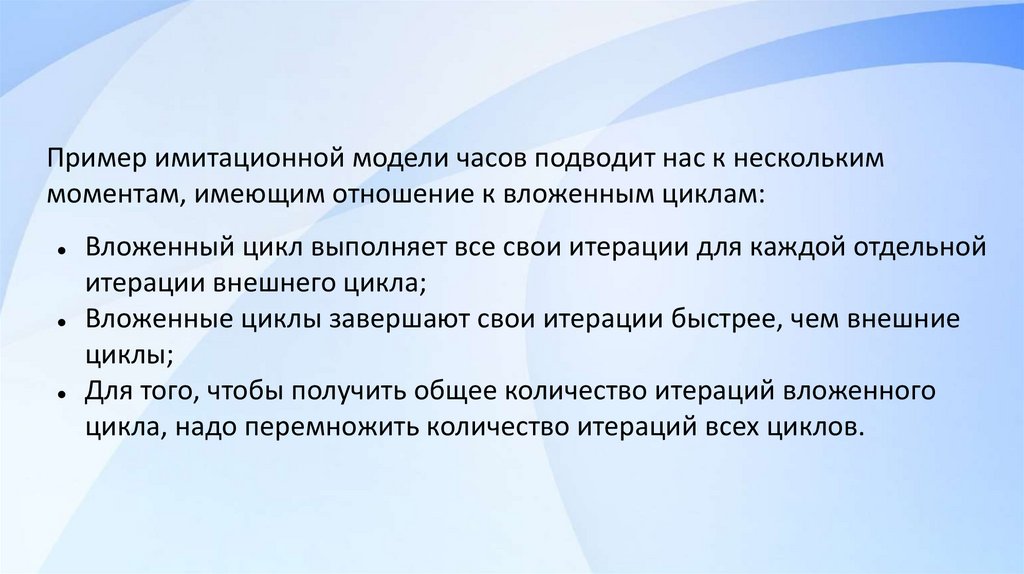 Пример имитационной модели часов подводит нас к несколькиммоментам, имеющим отношение к вложенным циклам: