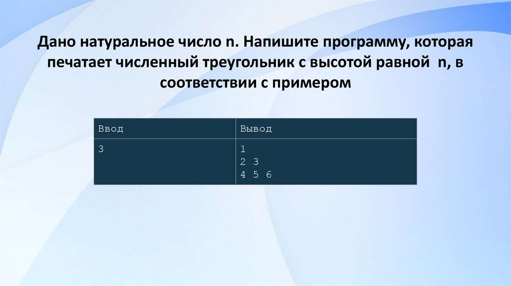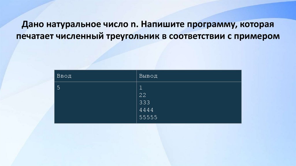 Дано натуральное число n. Напишите программу, котораяпечатает численный треугольник в соответствии с примером