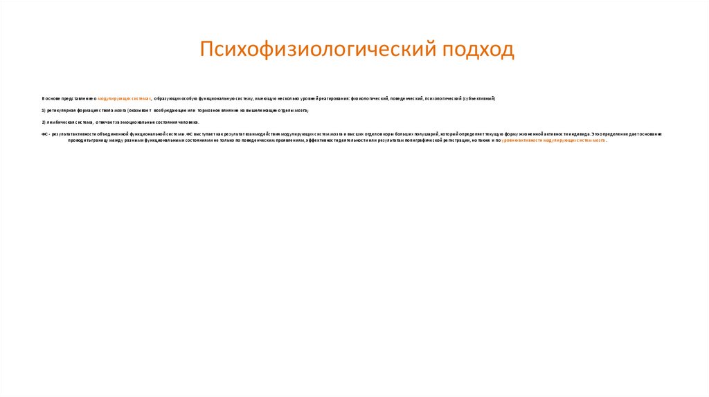 Психофизиологический подходВ основе представление о модулирующих системах, образующих особую функциональную систему, имеющую несколько уровней реагирования: физиологический, поведенческий, психологический (субъективный)