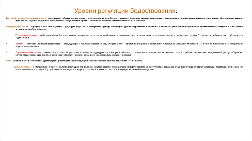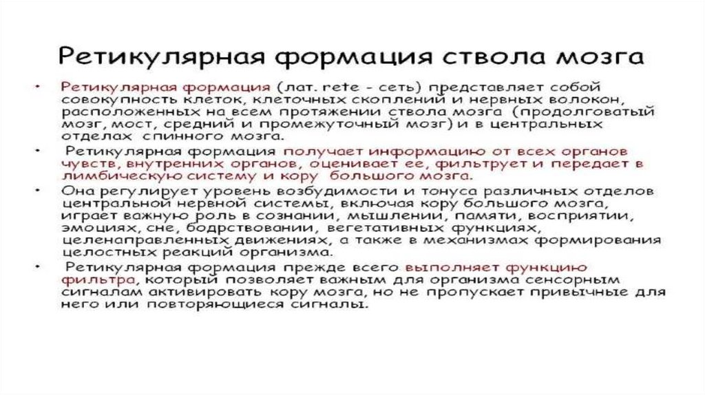 1) ретикулярная формация ствола мозга (оказывает возбуждающее или тормозное влияние на вышележащие отделы мозга;