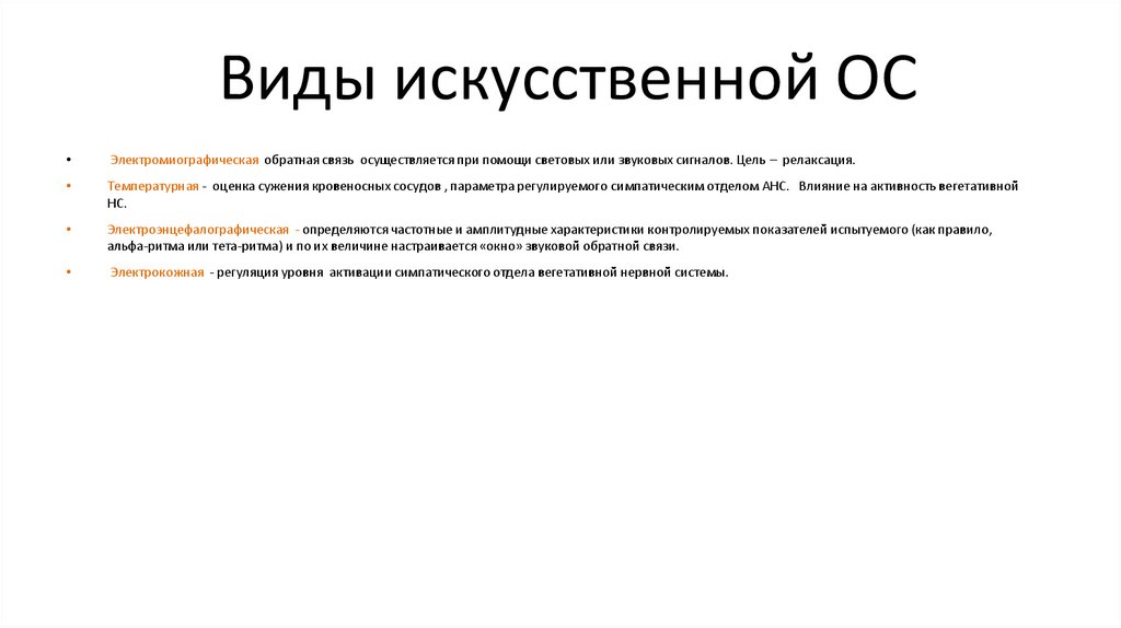 Виды искусственной ОСЭлектромиографическая обратная связь осуществляется при помощи световых или звуковых сигналов. Цель – релаксация.
