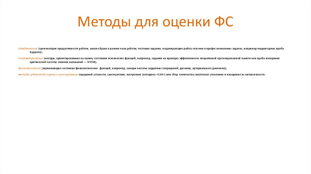 Методы для оценки ФСповеденческие (хронометраж продуктивности работы, анализ брака в разные часы работы; тестовые задания, моделирующие работу психики в профессиональных задачах, например корректурная проба