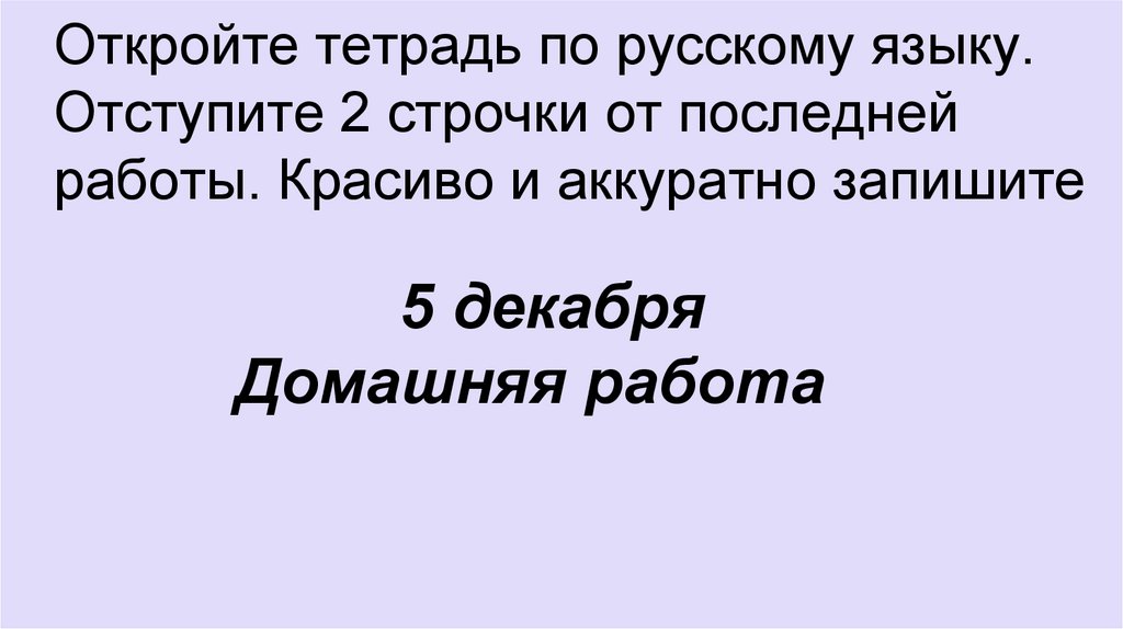 3. Откройте тетрадь по русскому языку. Отступите 2 строчки от последней работы. Красиво и аккуратно запишите