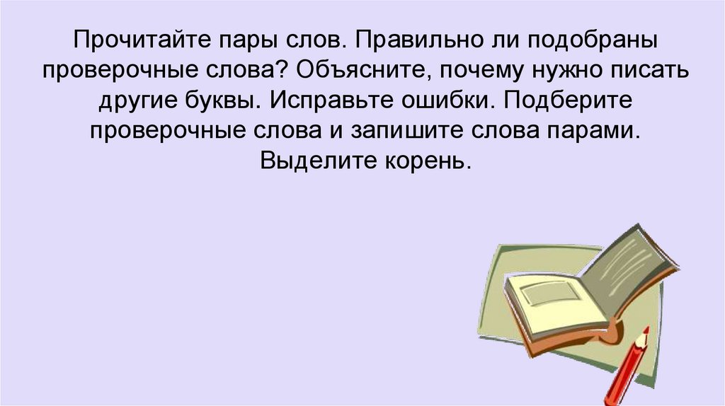 4. Прочитайте пары слов. Правильно ли подобраны проверочные слова? Объясните, почему нужно писать другие буквы. Исправьте ошибки.