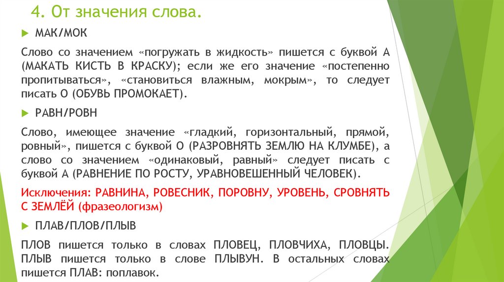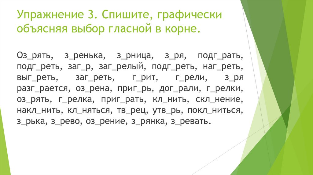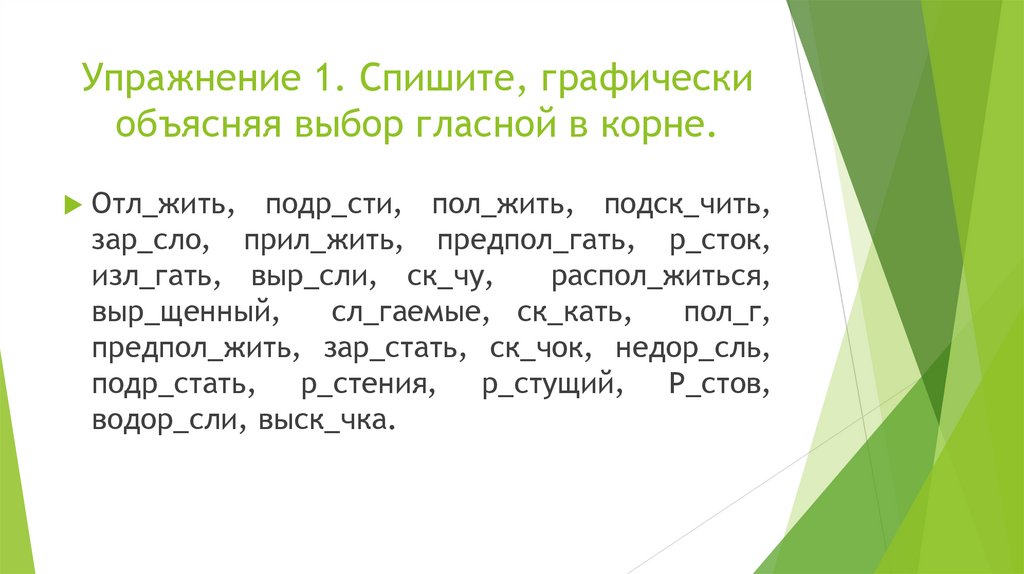 4. Упражнение 1. Спишите, графически объясняя выбор гласной в корне.
