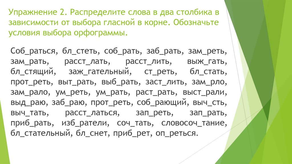 6. Упражнение 2. Распределите слова в два столбика в зависимости от выбора гласной в корне. Обозначьте условия выбора орфограммы.