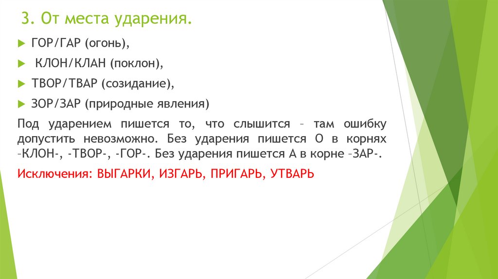 –КЛОН-, -ТВОР-, -ГОР-. Без ударения пишется А в корне –ЗАР-.