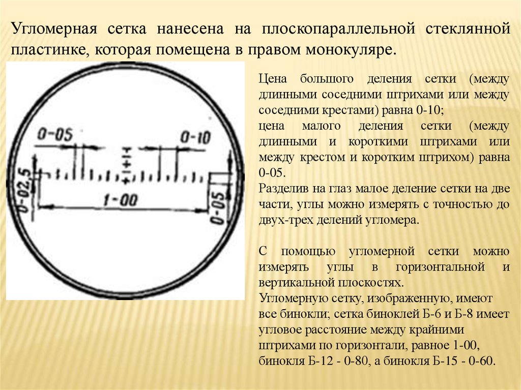 Угломерная сетка нанесена на плоскопараллельной стекляннойпластинке, которая помещена в правом монокуляре.
