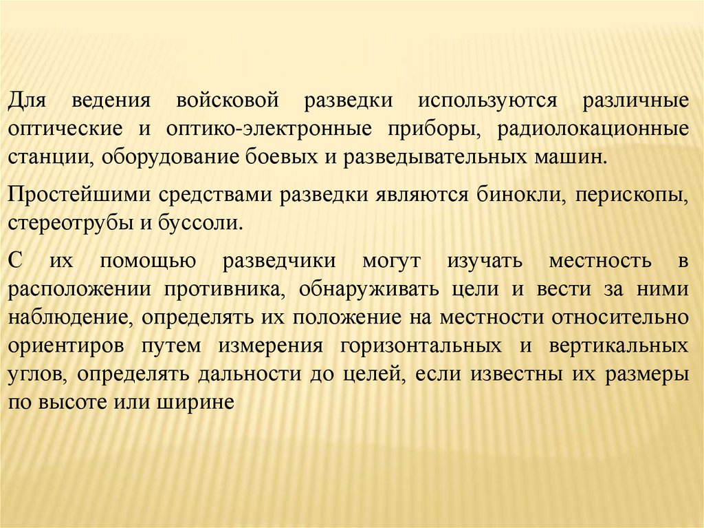 Для ведения войсковой разведки используются различныеоптические и оптико-электронные приборы, радиолокационные