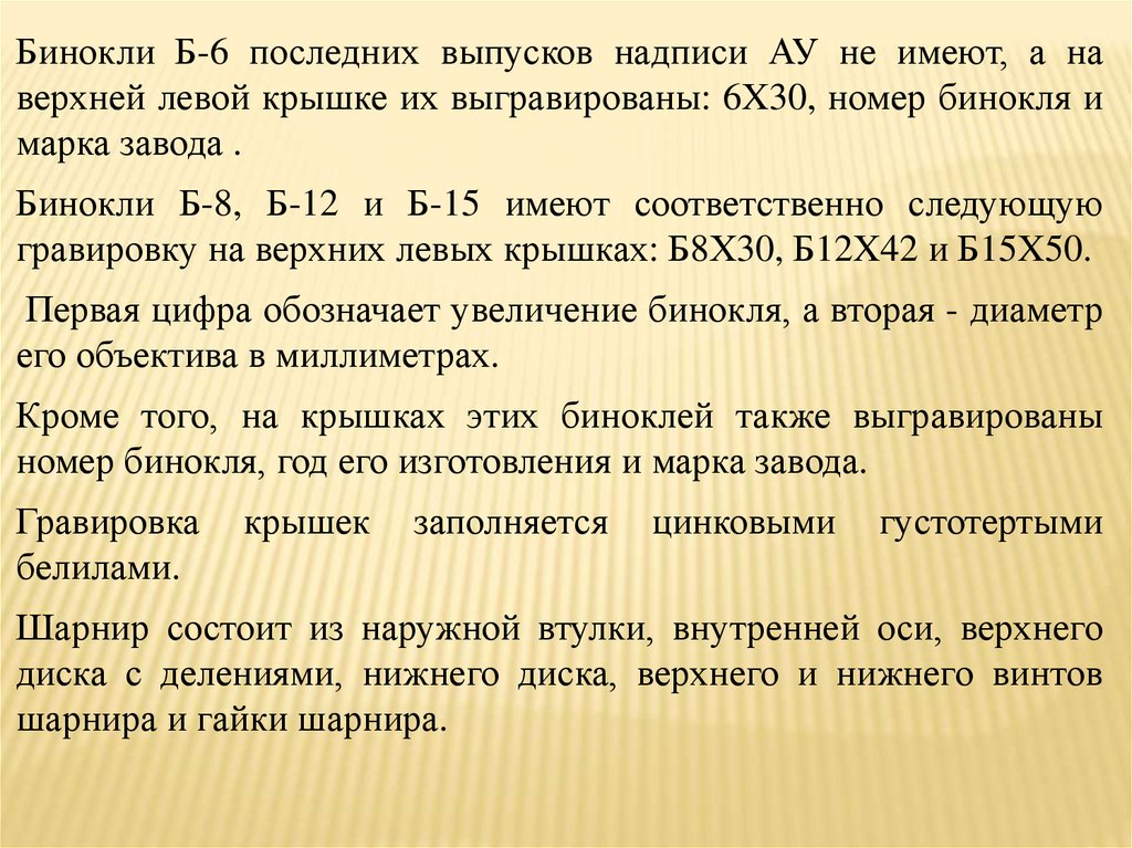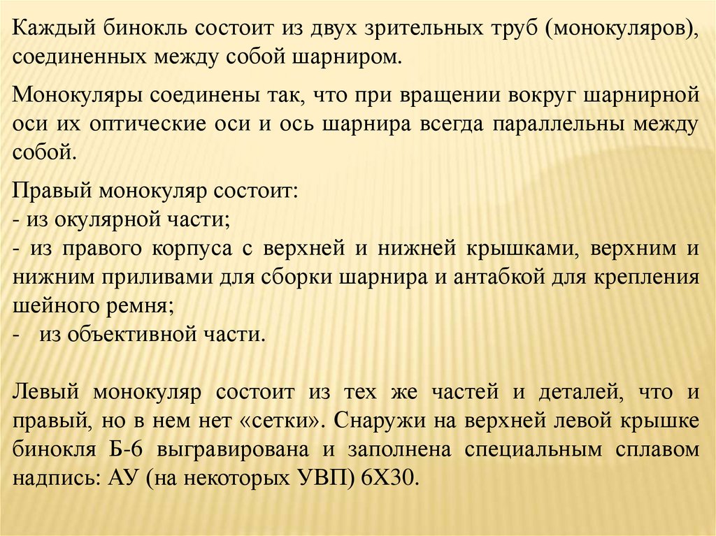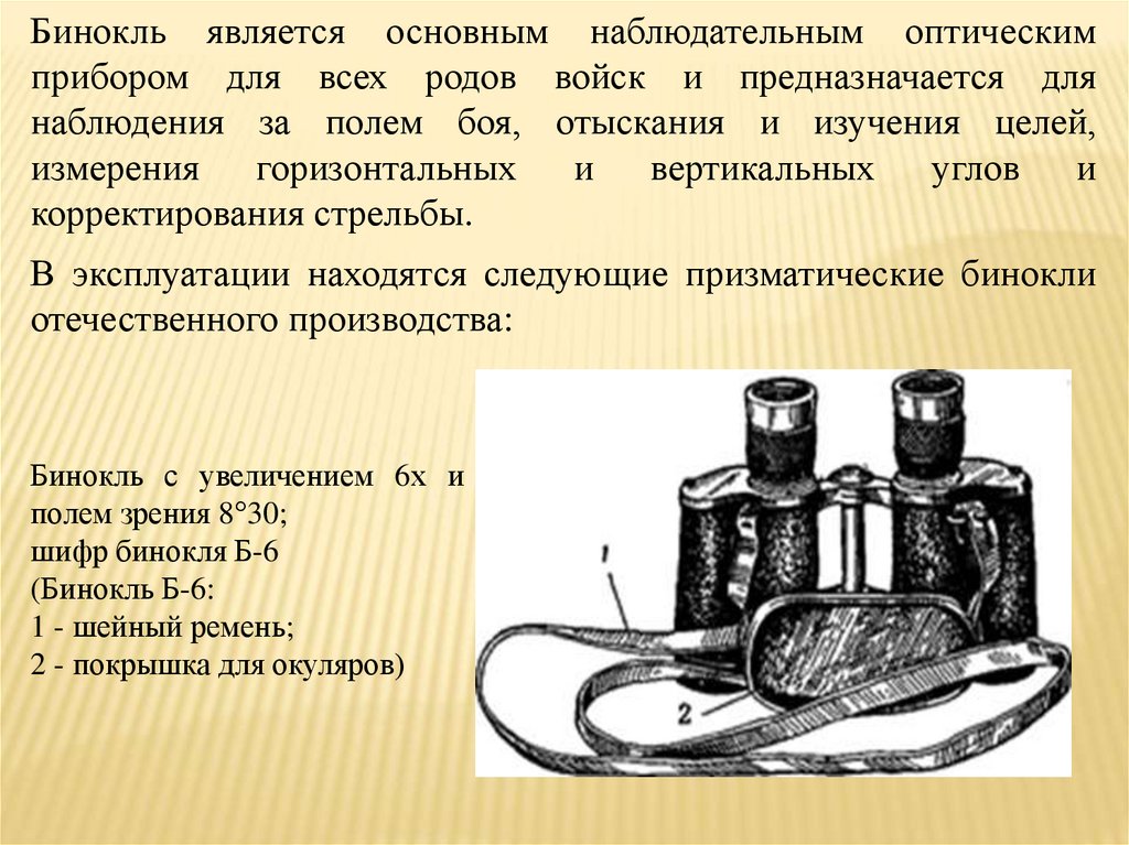 Бинокль является основным наблюдательным оптическимприбором для всех родов войск и предназначается для