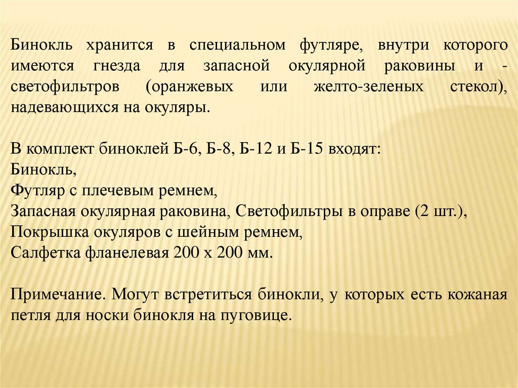 В комплект биноклей Б-6, Б-8, Б-12 и Б-15 входят: