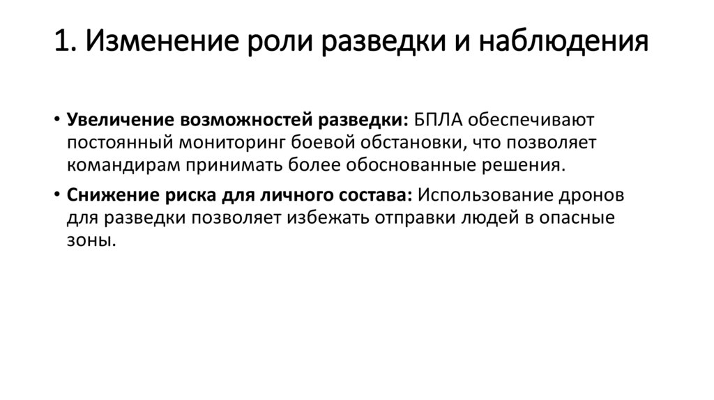 1. Изменение роли разведки и наблюдения• Увеличение возможностей разведки: БПЛА обеспечивают