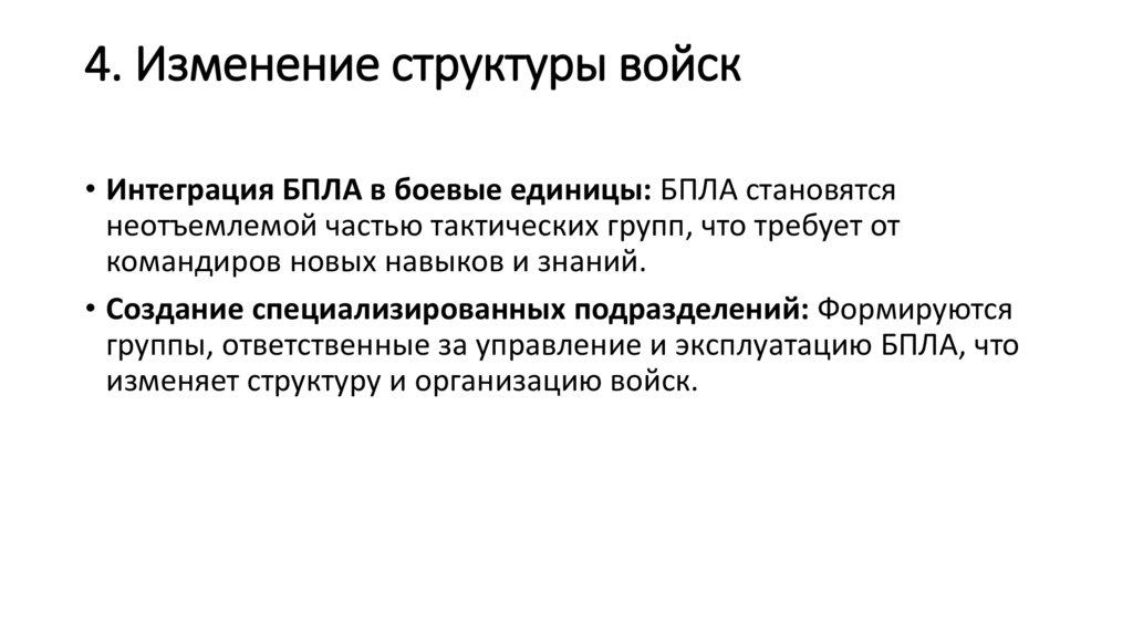 • Интеграция БПЛА в боевые единицы: БПЛА становятсянеотъемлемой частью тактических групп, что требует от
