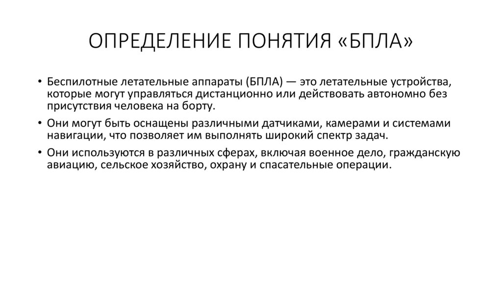 • Беспилотные летательные аппараты (БПЛА) — это летательные устройства,которые могут управляться дистанционно или действовать автономно без