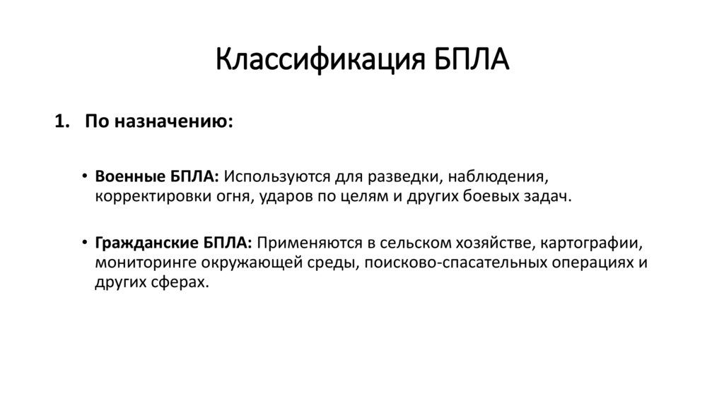 1. По назначению:• Военные БПЛА: Используются для разведки, наблюдения,