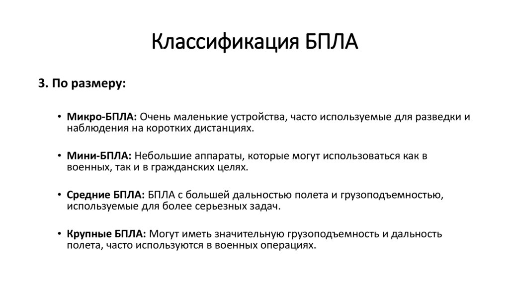 3. По размеру:• Микро-БПЛА: Очень маленькие устройства, часто используемые для разведки и