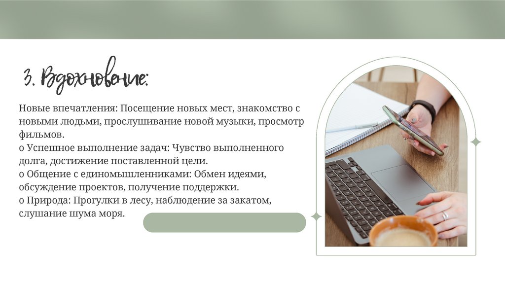 3. Вдохновение:Новые впечатления: Посещение новых мест, знакомство с