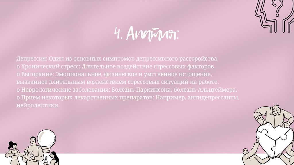 4. Апатия:Депрессия: Один из основных симптомов депрессивного расстройства.