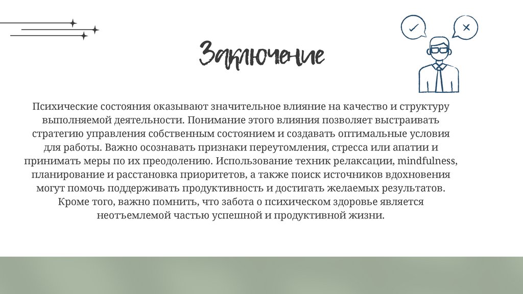 ЗаключениеПсихические состояния оказывают значительное влияние на качество и структуру