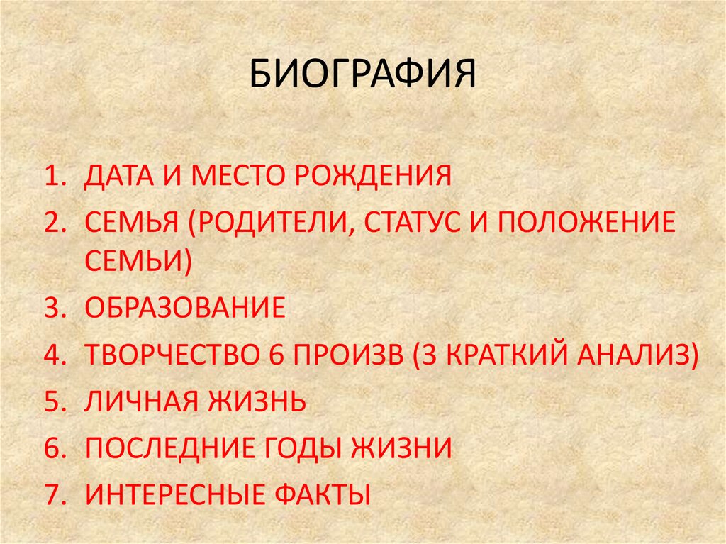1. ДАТА И МЕСТО РОЖДЕНИЯ2. СЕМЬЯ (РОДИТЕЛИ, СТАТУС И ПОЛОЖЕНИЕ