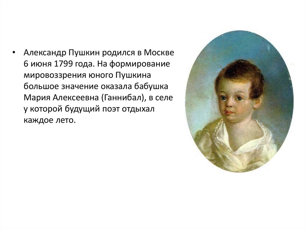 • Александр Пушкин родился в Москве6 июня 1799 года. На формирование