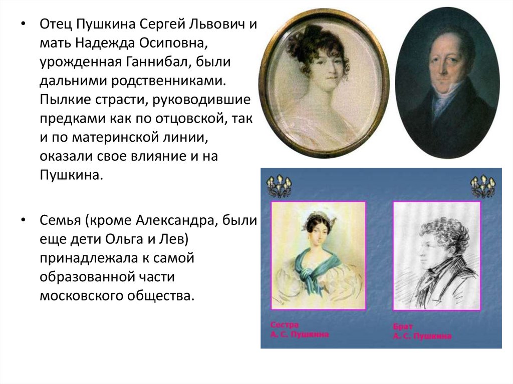• Отец Пушкина Сергей Львович имать Надежда Осиповна,