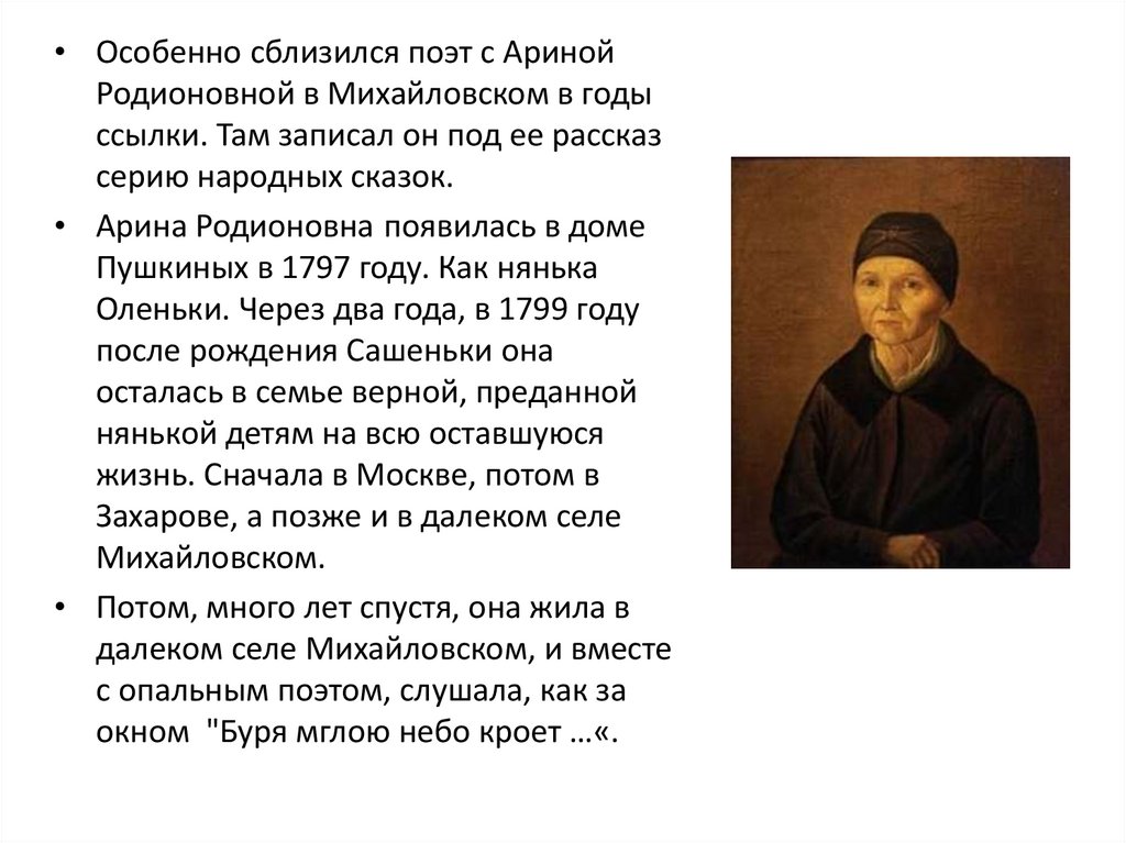 • Особенно сблизился поэт с АринойРодионовной в Михайловском в годы