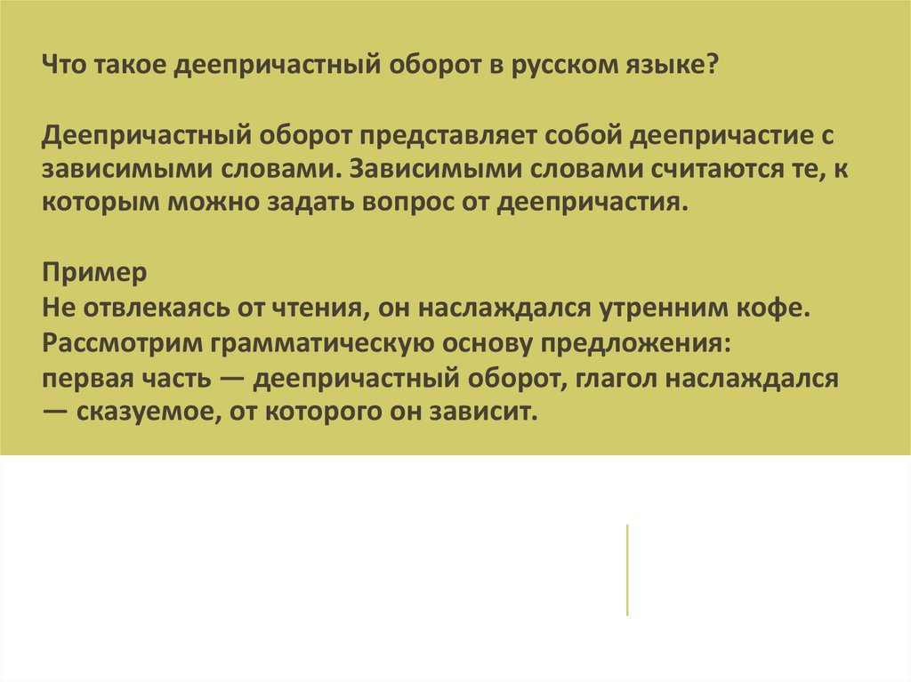 Что такое деепричастный оборот в русском языке?Деепричастный оборот представляет собой деепричастие с