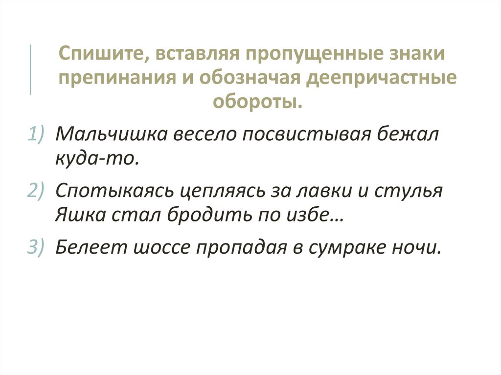 Спишите, вставляя пропущенные знакипрепинания и обозначая деепричастные