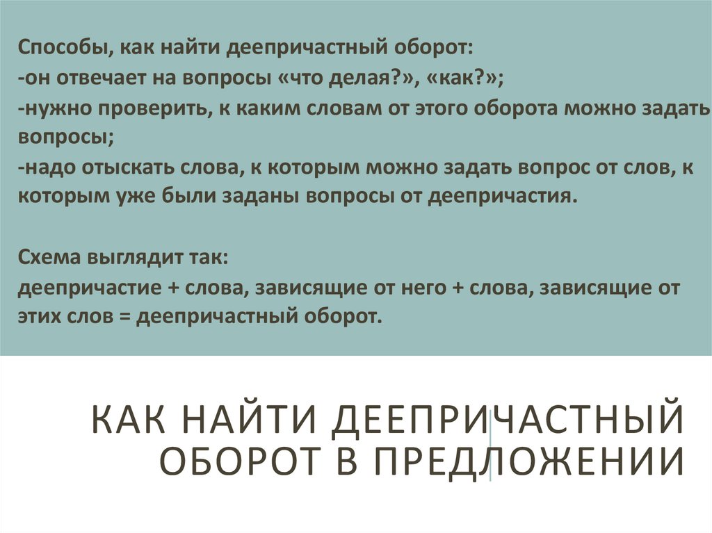 Способы, как найти деепричастный оборот:-он отвечает на вопросы «что делая?», «как?»;