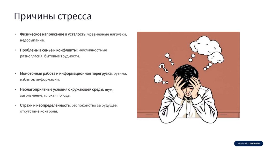Причины стресса• Физическое напряжение и усталость: чрезмерные нагрузки,
