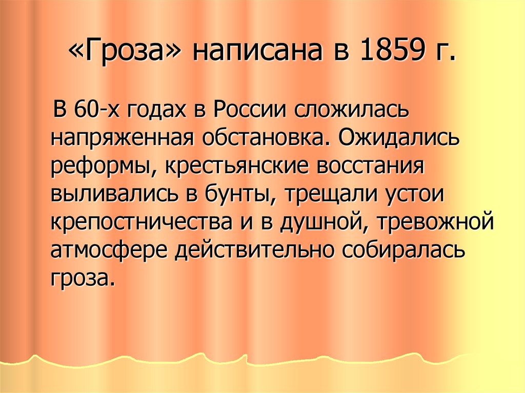 «Гроза» написана в 1859 г.В 60-х годах в России сложилась