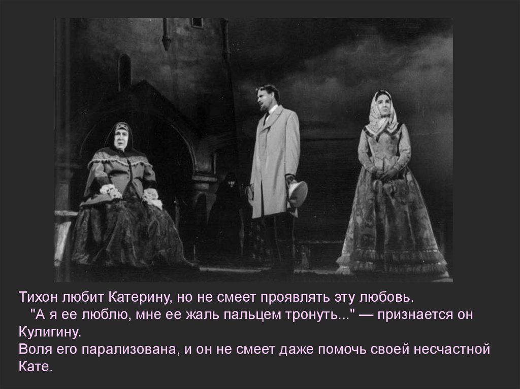 Тихон любит Катерину, но не смеет проявлять эту любовь."А я ее люблю, мне ее жаль пальцем тронуть..." — признается он