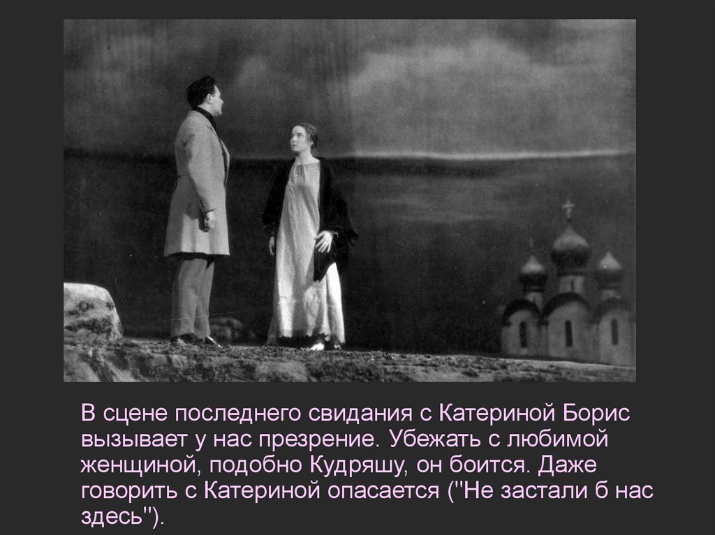 В сцене последнего свидания с Катериной Борисвызывает у нас презрение. Убежать с любимой