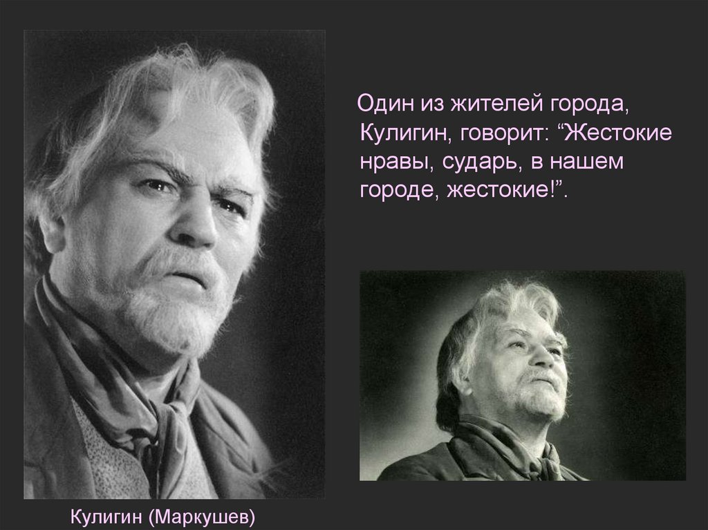 Один из жителей города,Кулигин, говорит: “Жестокие