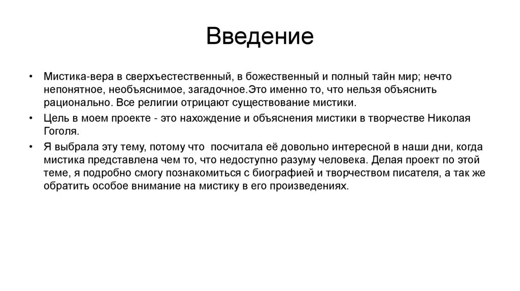 • Цель в моем проекте - это нахождение и объяснения мистики в творчестве Николая