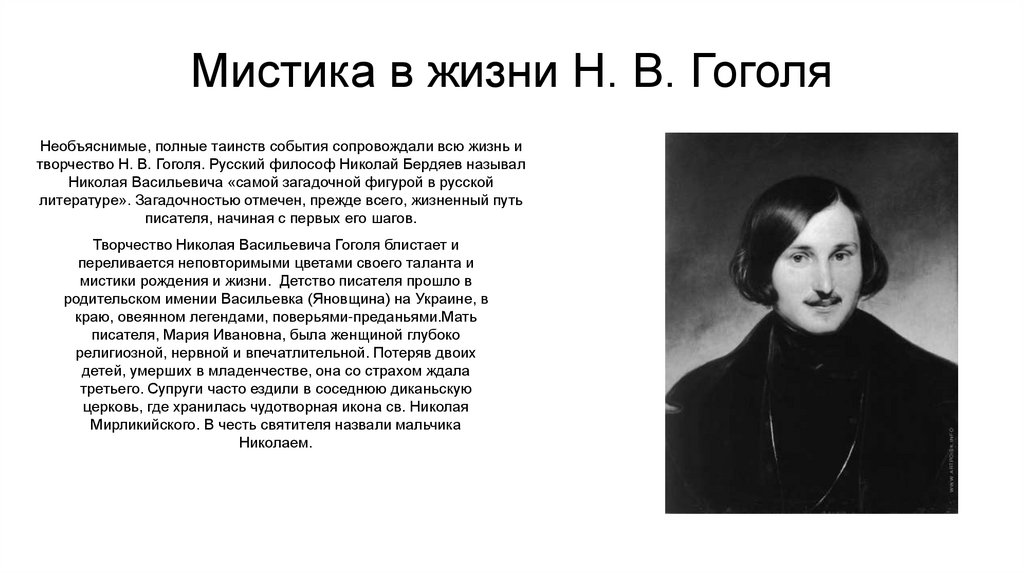 Необъяснимые, полные таинств события сопровождали всю жизнь итворчество Н. В. Гоголя. Русский философ Николай Бердяев называл