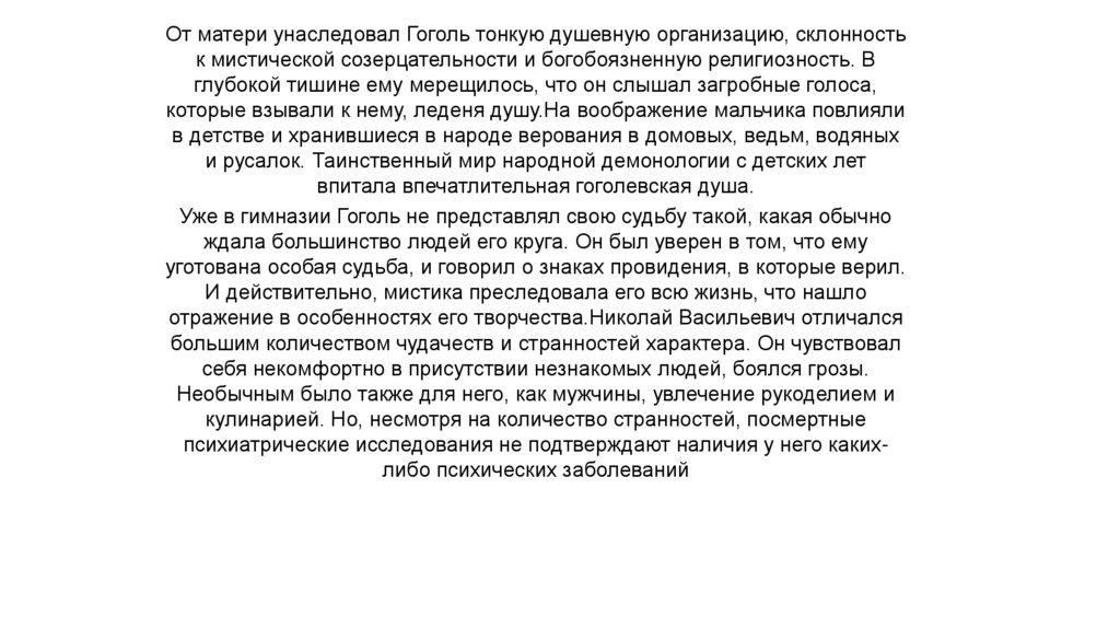 От матери унаследовал Гоголь тонкую душевную организацию, склонностьк мистической созерцательности и богобоязненную религиозность. В