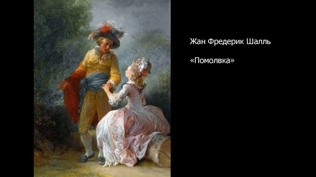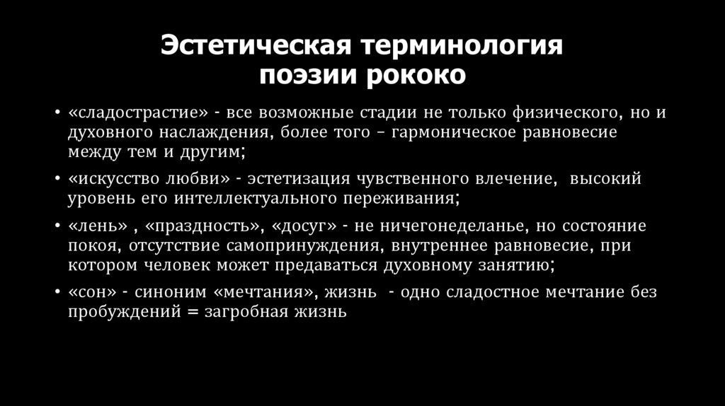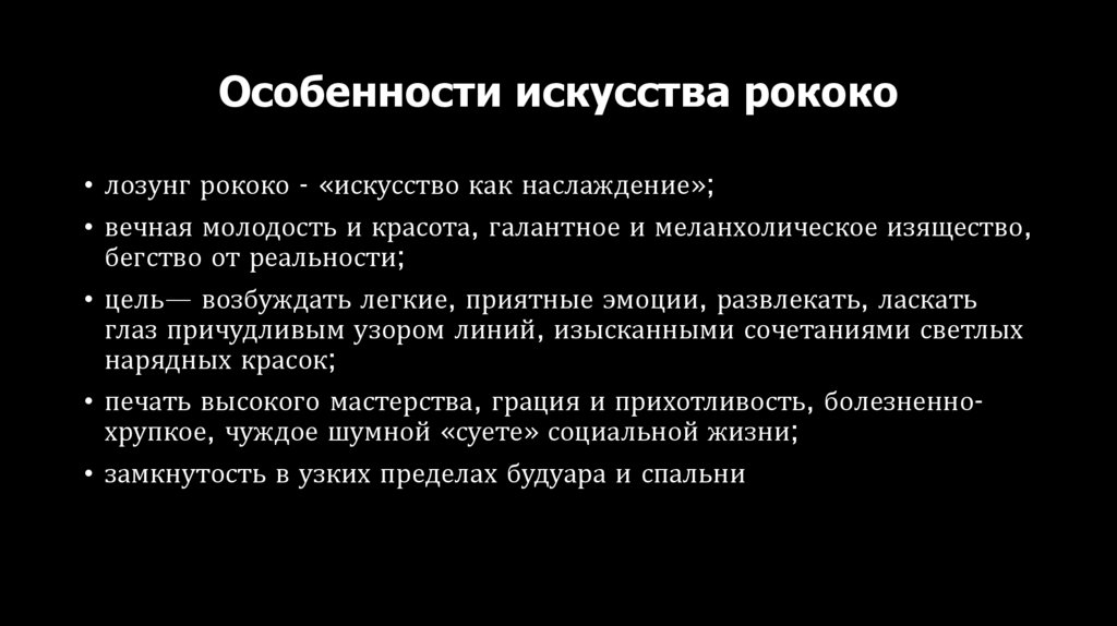• лозунг рококо - «искусство как наслаждение»;• вечная молодость и красота, галантное и меланхолическое изящество,